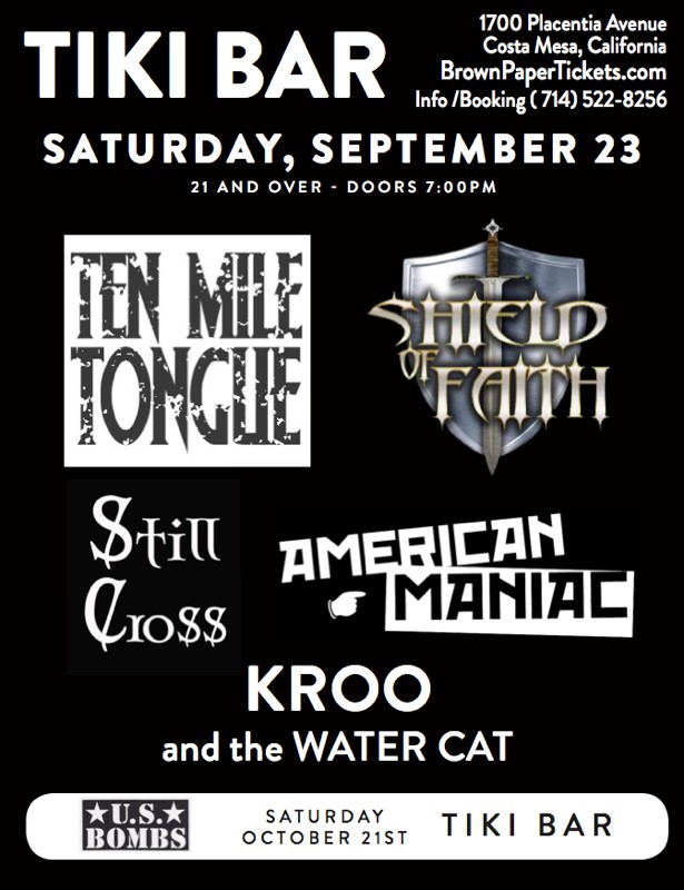 Live music from Ten Mile Tongue, Shield of Faith, Still Cross, American Maniac and KROO and the Water Cat
