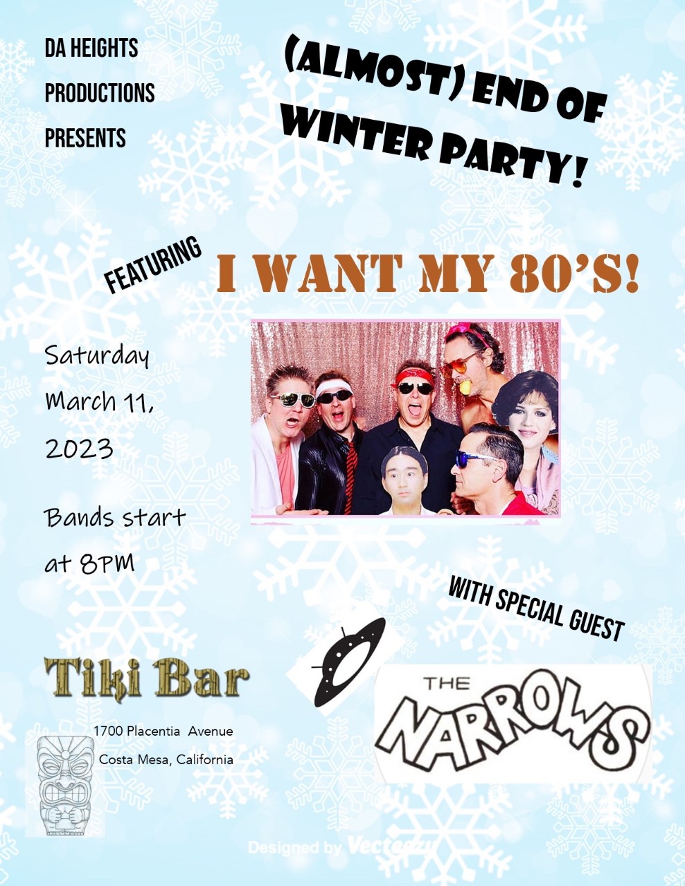 Tiki Bar 1700 Placentia Ave, Costa Mesa, CA, United StatesLive music from I want my 80's and the Narrows