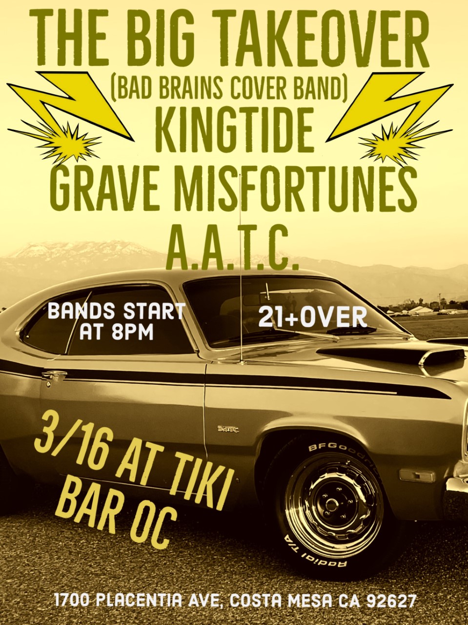 Tiki Bar 1700 Placentia Ave, Costa Mesa, CA, United StatesLive music from Kingtide, Grave Misfortunes and A.A.T.C.