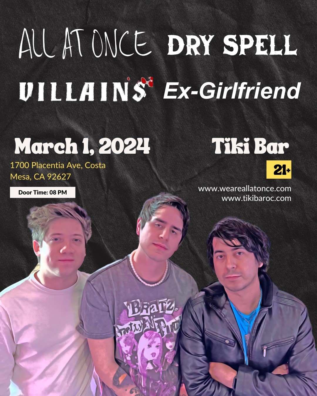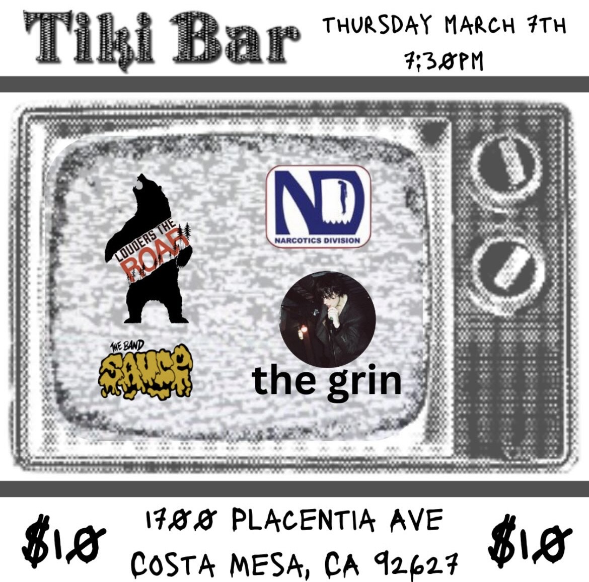 Narcotics Division March 7, 2024 @ 7:00 pm Tiki Bar 1700 Placentia Ave, Costa Mesa, CA, United States Live music from Narcotics Division, Louders The Roar, The Band Sauce, The Grin