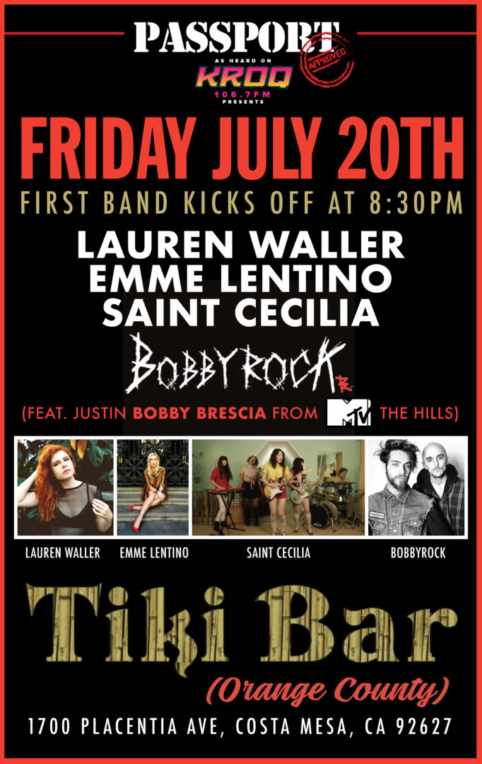 Tiki Bar 1700 Placentia Ave, Costa Mesa, CA, United StatesLive music from BobbyrocK, Emme Lentino, Lauren Waller and Saint Cecilia