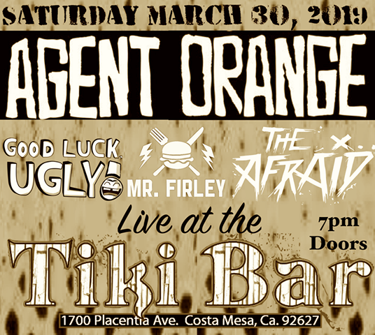 Live music from AGENT ORANGE! Along with Mr. Firley, Good Luck Ugly!, Alcohol Abuse and The Afraid Tickets available at: https://www.brownpapertickets.com/event/4048639