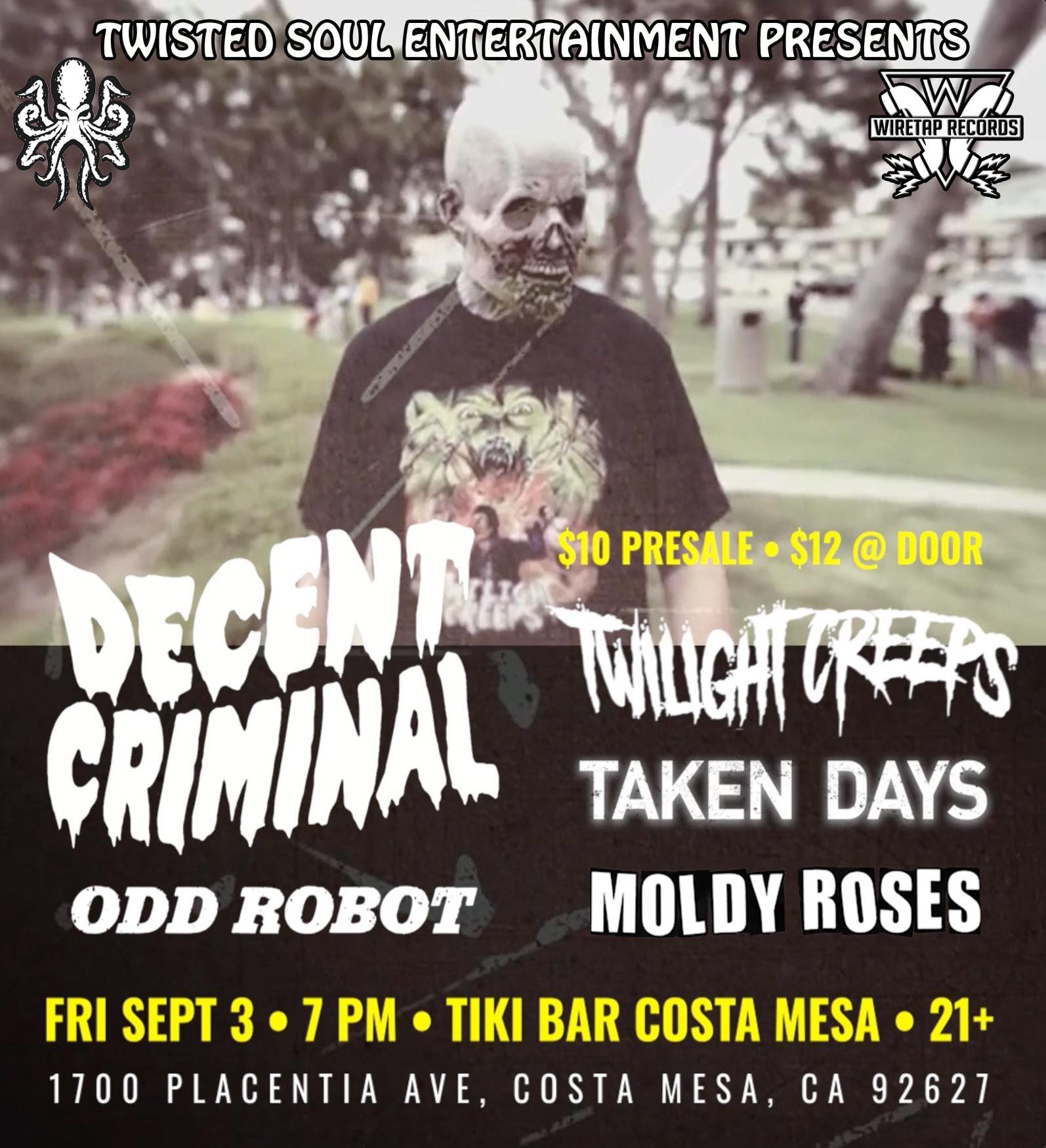 Live music from Twilight Creeps, Decent Criminal, Odd Robot, Taken Days and Moldy Roses
